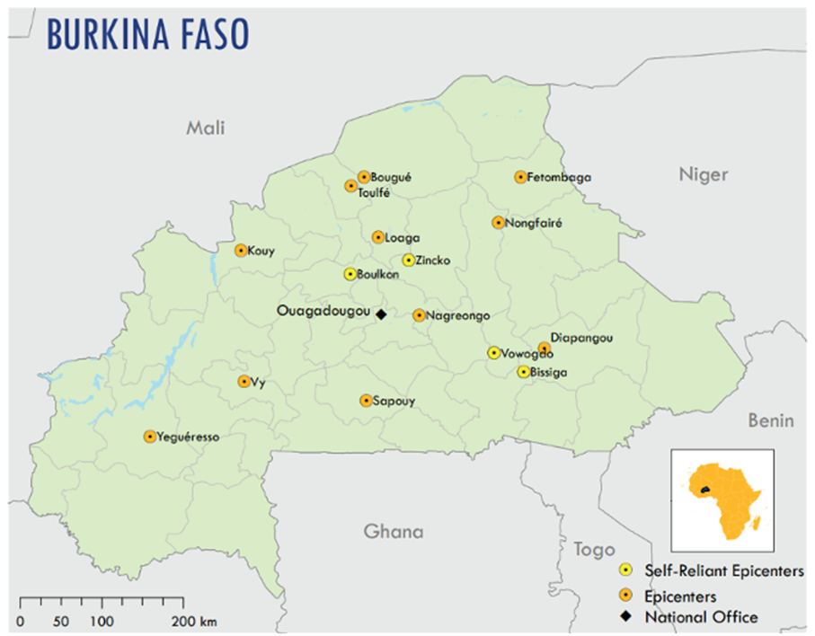 Das Hunger Projekt (THP) Burkina Faso ist seit 1997 vor Ort aktiv und ein verlässlicher Partner für nachhaltige Entwicklung. Gemeinsam mit den Dorfgemeinschaften wurden bereits 10 selbstständige Epicenter aufgebaut, die insgesamt rund 222’000 Menschen erreichen. Die dort entwickelten Programme und Infrastrukturen – darunter Gesundheitsstationen, Banken und Schulen – werden heute erfolgreich aus eigener Kraft und ohne externe Finanzierung von der lokalen Bevölkerung weitergeführt.
